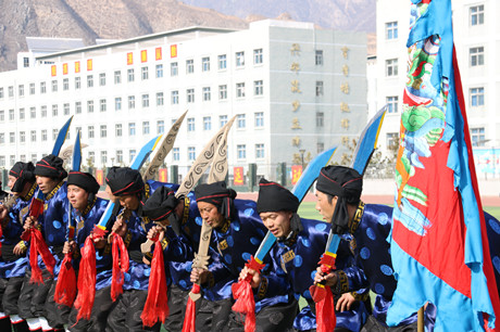 舟曲县峰迭镇朱隆巴沟200多名村民,为全县人民献上摆阵舞,丰富了群众的春节文娱生活。摆阵舞又名茅都嗨舞,主要表现舟曲藏族先民战前动员、祭祀摆阵、战斗、比武的情形,摆阵舞既是藏族的一种节庆民俗活动,又是藏族部族训练男丁保家卫国的一种形式。
