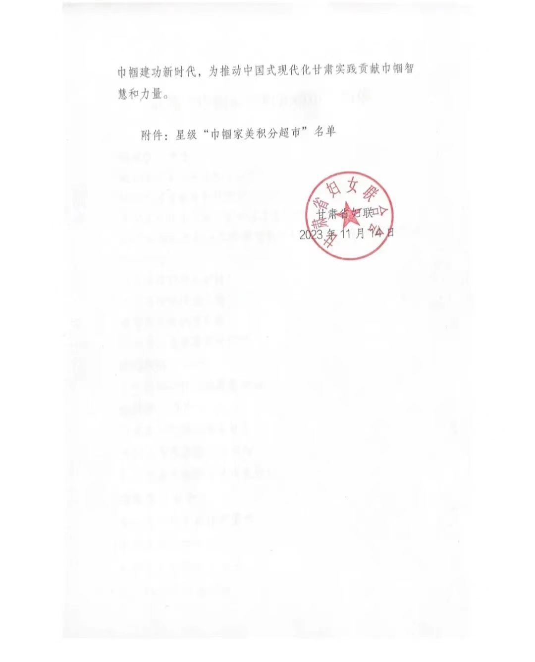 近日,省妇联下发《关于决定命名星级“巾帼家美积分超市”的通知》,命名全省100家“巾帼家美积分超市”为星级“巾帼家美积分超市”。其中,甘南州有9家超市入选。