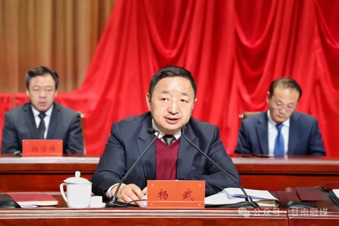 州委副书记、州长杨武主持会议并讲话。州人大常委会主任胡晓华,州四大班子副地级以上领导干部,以及甘南军分区、甘肃民族师范学院、州法检两院主要领导出席会议。