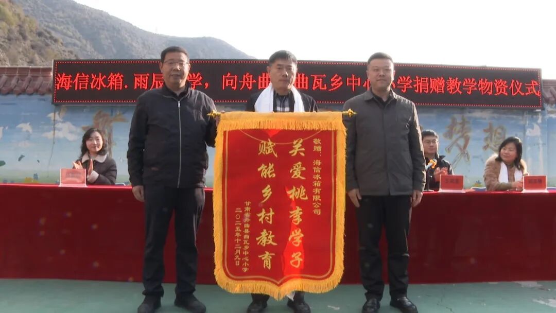 12月9日,在“组团式”帮扶的推动下,“海信冰箱 雨辰助学”公益团队,将一批满载关怀的教学物资送达舟曲县曲瓦乡中心小学,以实际行动支持偏远山区的教育事业。县委常委、组织部部长胡鹏出席会议并讲话,县委常委、副县长王成龙主持活动,“海信冰箱 雨辰助学”发起人王震、青岛理工大学刘志艳教授、公益团队及县教育局、曲瓦乡党委、曲瓦中心小学教师学生等100人参加了活动。