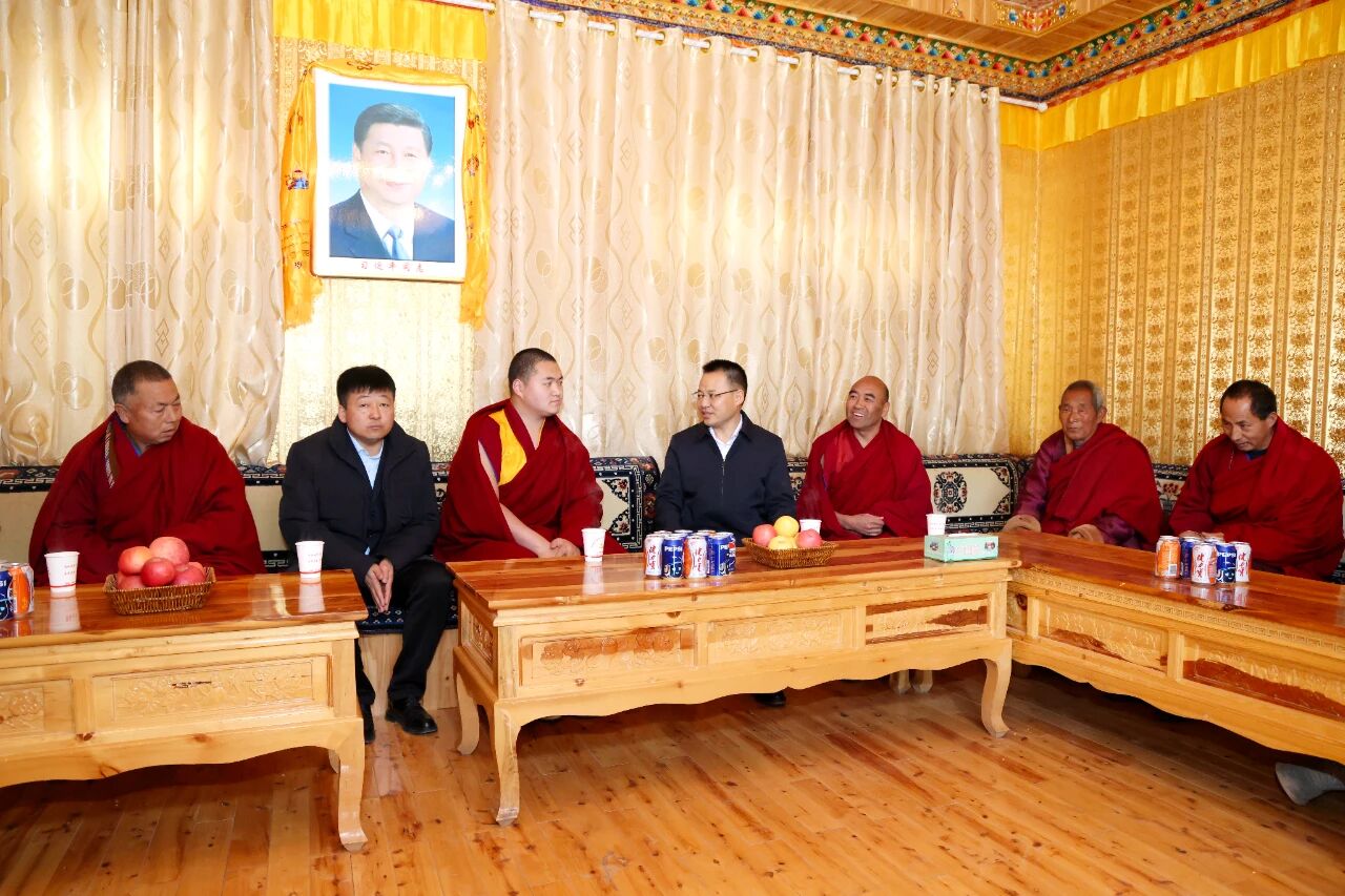 在黑峪寺,王海青详细询问僧侣学习生活、寺庙管理、佛事活动及消防安全等情况。他强调,要深入学习贯彻习近平总书记关于宗教工作的重要论述和新时代党的治藏方略,坚持党对宗教工作的领导,以铸牢中华民族共同体意识为主线,持续推进藏传佛教中国化,巩固拓展“三个意识”学习教育成果,深入开展“学法规、守戒律、重修为、树形象”教育活动,积极引导广大宗教界人士和信教群众感党恩、听党话、跟党走,不断巩固民族团结、宗教和顺、社会和谐的大好局面。
