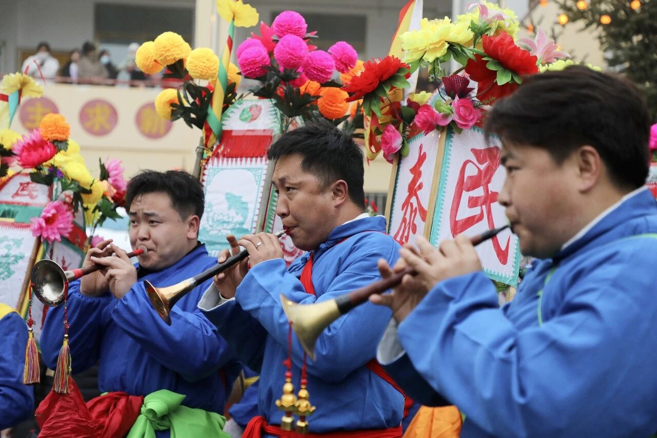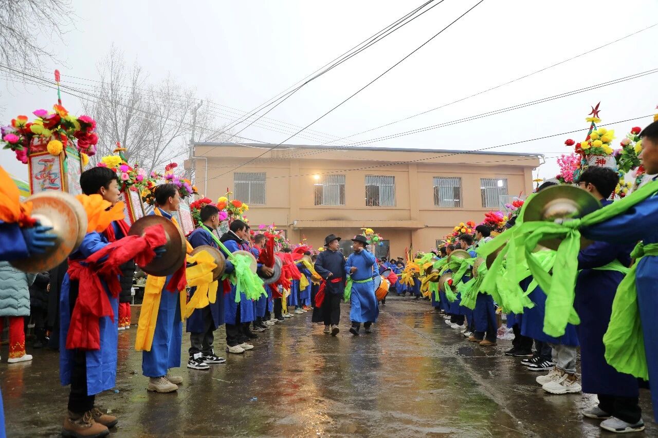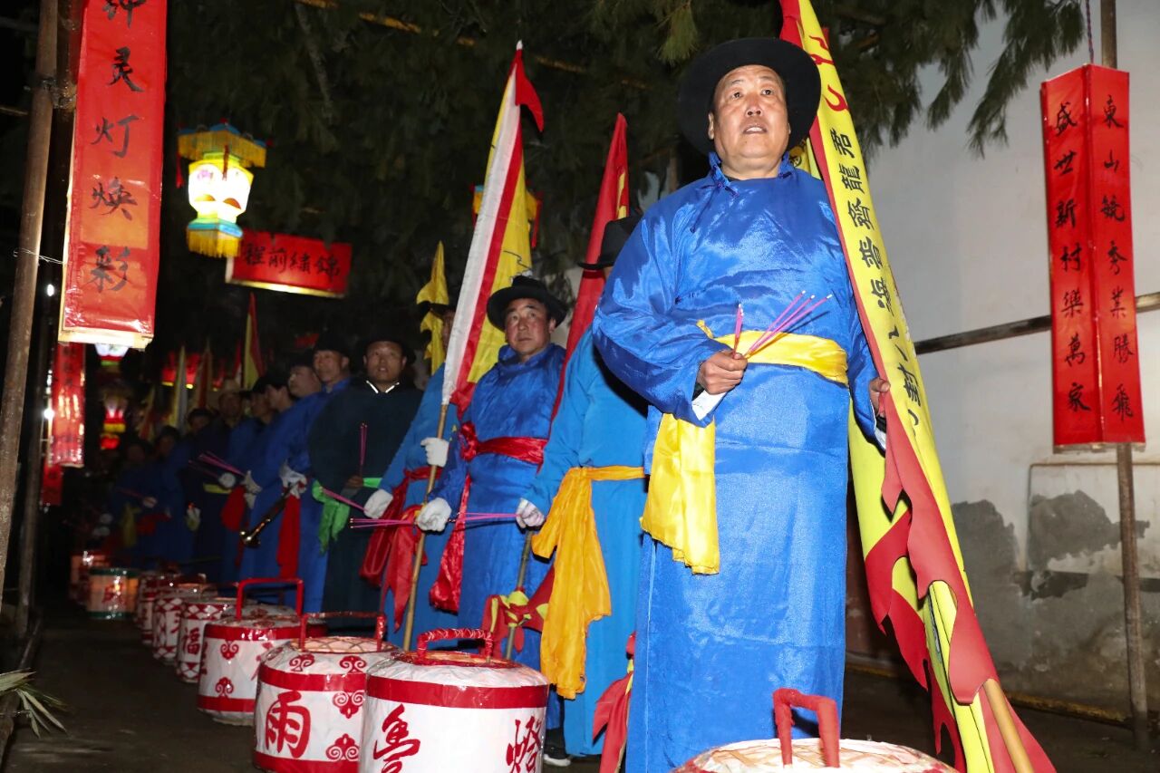 夜幕低垂,石家山村内灯火如昼。160余名身着蓝布长衫的转灯队成员身背自制背灯,在头灯的带领下浩荡出发。蜿蜒的队伍如游龙般穿行于石家山村、韩沟村等地的田间小道,他们口念心诀,脚踩“七步云子八步拐”的独特步伐,在夜色中踩踏出遒劲有力的字样。放眼望去,灯火蜿蜒,足迹相连,宛若巨幅大地艺术作品,将“簪花迎春”“国泰民安”“风调雨顺”“五谷丰登”等吉祥话语铺展在大地之上,寄托着对来年五谷丰登、福寿康宁的千年祈愿。