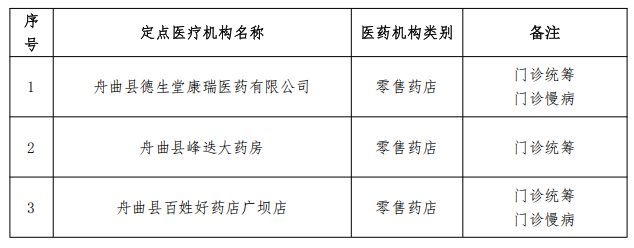公示期满后无异议,拟新增门诊慢特病、门诊统筹零售药店到舟曲县医疗保障服务中心签订《舟曲县医疗保障定点门诊慢特病、门诊统筹服务协议书》,逾期未签订视为自动放弃。