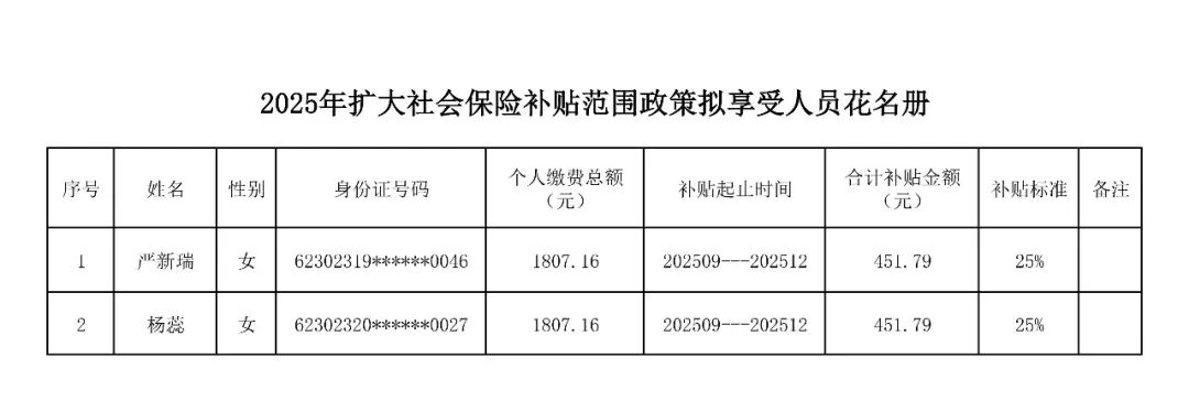 为深入贯彻党中央、国务院决策部署,着力稳就业、稳企业、稳市场、稳预期,根据甘肃省人社厅、财政厅《关于加快推进扩大社会保险补贴范围政策落实有关工作的通知》(甘人社通〔2025〕264号)文件精神,面向重点行业领域的中小微企业的重点群体发放社保补贴,经单位申请、部门审核,现将符合申领社保补贴人员明细信息予以公示,主动接受社会各界监督。如发现有提供虚假材料套取补贴资金或其他不符合领取情形的,可通过来电、来信、来访等形式反映,县人社局将认真进行受理,并反馈调查核实结果;如无反映问题,将按照规定程序进行补贴拨付。
