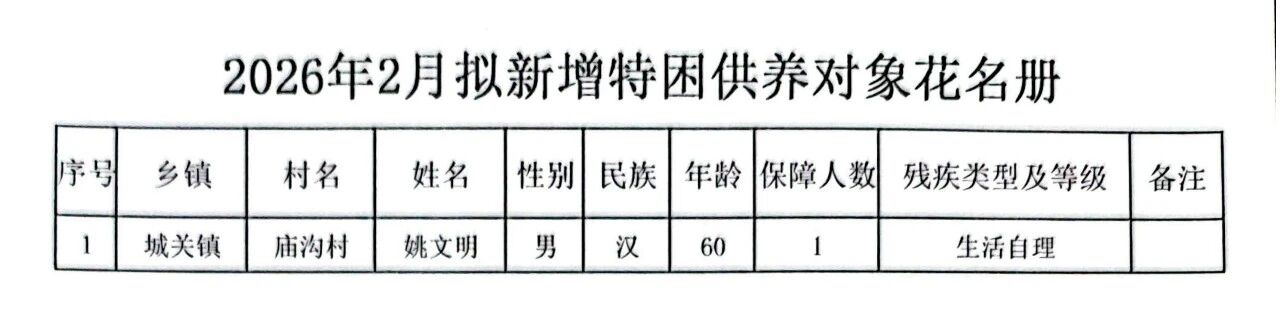 按照城乡低保、特困供养有关政策规定,经本人申请,乡镇政府审核,县民政局审批确认。以下家庭(个人)拟于2026年2月新增最低生活保障、特困供养范围,现予公示。请广大群众监督,如有异议者请通过以下电话反映。