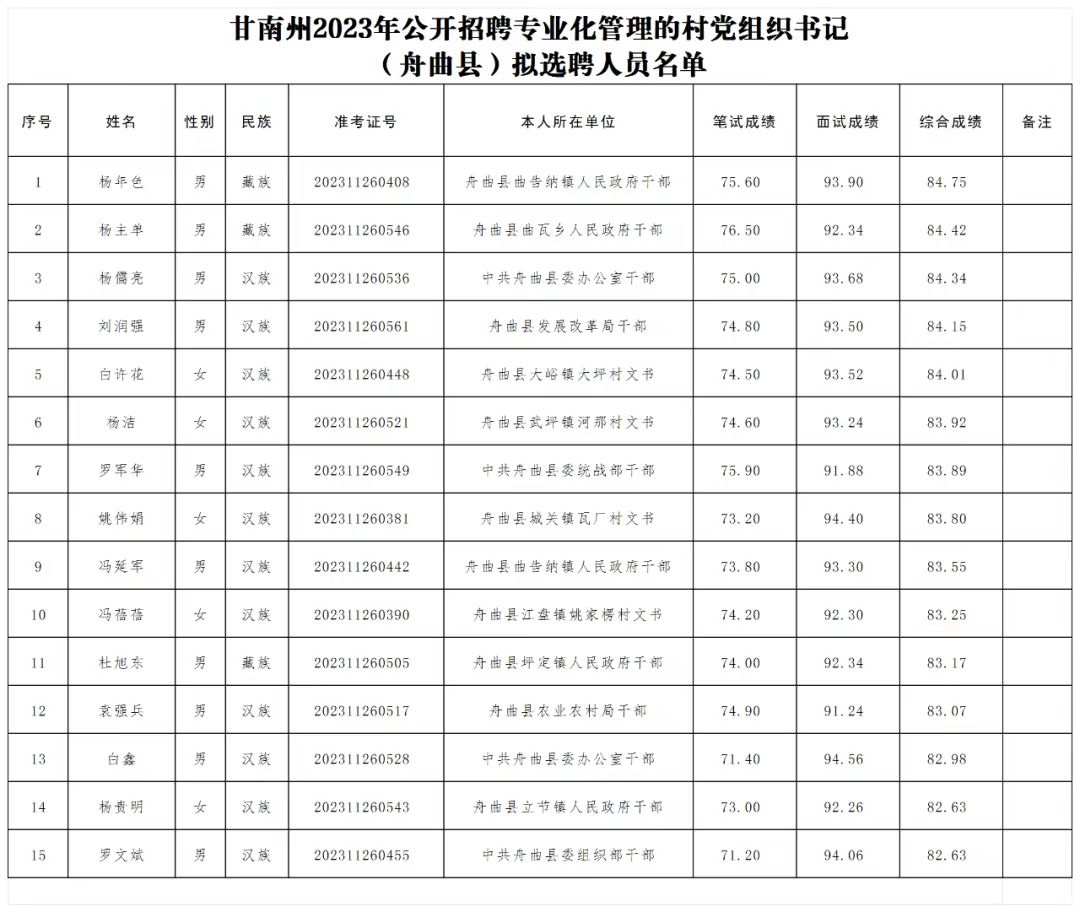 根据《甘南州2023年专业化管理的村党组织书记招聘公告》要求,经笔试、面试、体检、资格联审及组织考察等程序,舟曲县确定专业化管理的村党组织书记拟聘用人员15名,现将拟聘用人员有关情况予以公示,接受广大干部群众监督。如发现在德、能、勤、绩、廉等方面有影响任职的问题,可通过电话、面谈、来信等形式反映,我们将认真受理,并向署名或当面反映问题的干部群众反馈调查核实结果。如不存在影响任职的问题,将按有关规定办理任职手续。