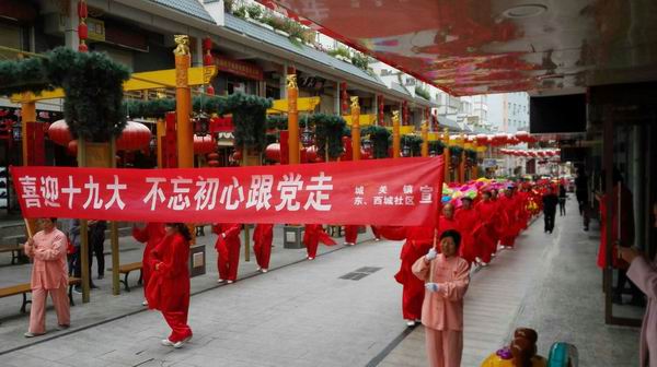 “盛世迎盛会,伟业耀千秋”,中国共产党第十九次全国代表大会于今天在北京召开,这是在全面建成小康社会决胜阶段、中国特色社会主义发展关键时期召开的一次十分重要的大会。为营造良好的社会氛围,城关镇东、西城社区组织居民举行扭秧歌庆祝活动。