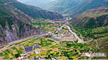 仲夏时节的舟曲县曲瓦乡城马村,成熟的小麦与苍翠的树木相互映衬,呈现出一派美丽的田园风光图。