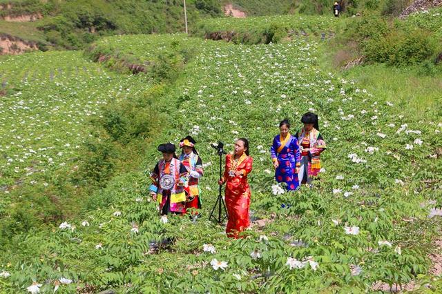 近日,在舟曲县插岗乡角绕村的田间,一簇簇油用牡丹花竞相绽放,青翠的绿叶,洁白的花瓣随风起舞,花香扑鼻而来,吸引了不少游客前来赏花、游玩。