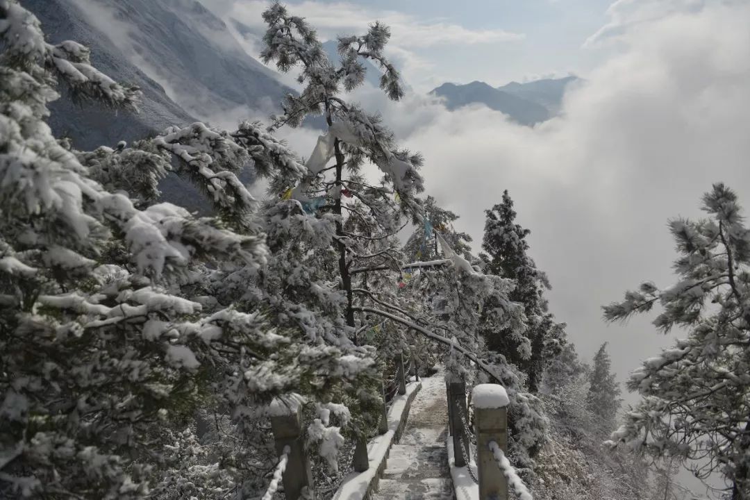 出得庙宇,骋目四望,天与云、与峰、与雪、与松,历历分明却又浑然一体。茫然四顾,恍惚间,离尘世越来越远,离灵魂越来越近,在这无边雪色里,神与人,似乎只隔了一副皮囊的距离……
