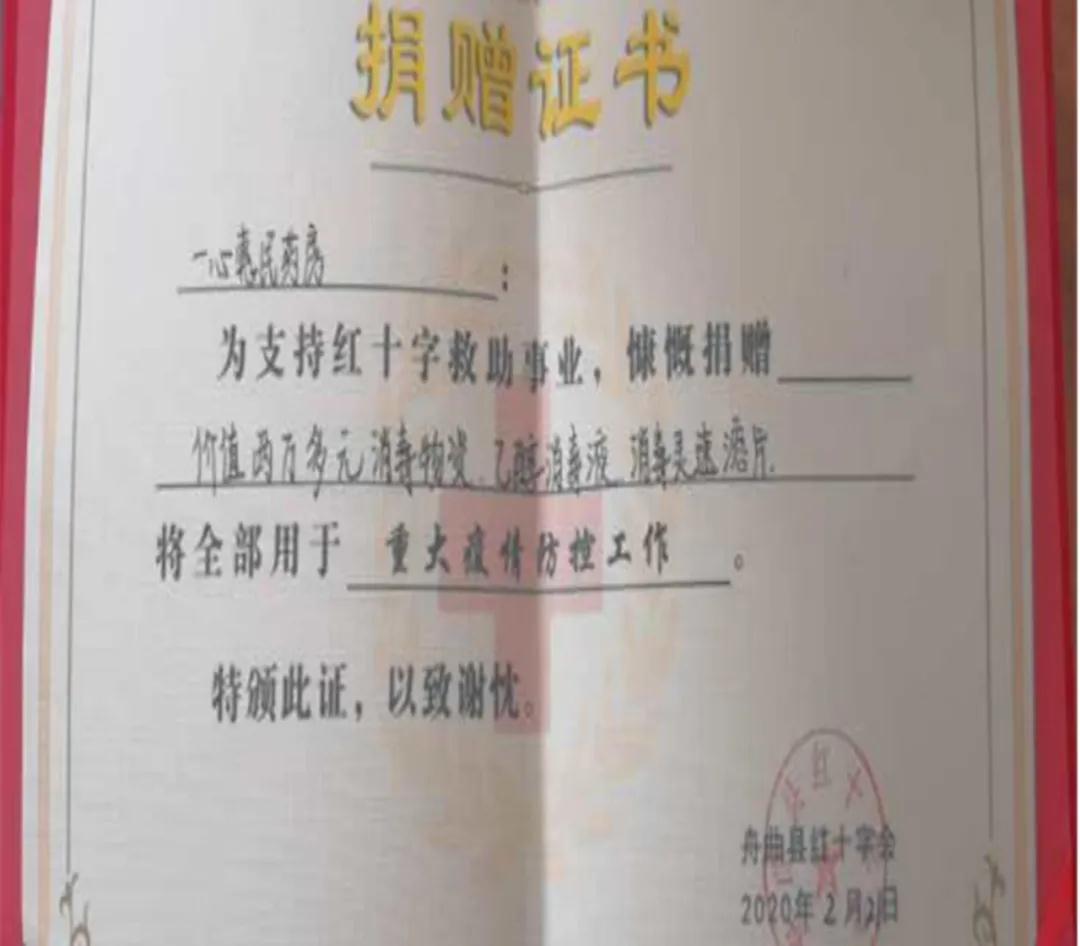 正值全县疫情防控的关键时期,舟曲县工商联会员一心惠民药房积极响应县工商联的倡议,筹措紧缺物资,通过县红十字会为全县捐赠乙醇消毒液、消毒灵速溶片等物资,总计价值2万余元。