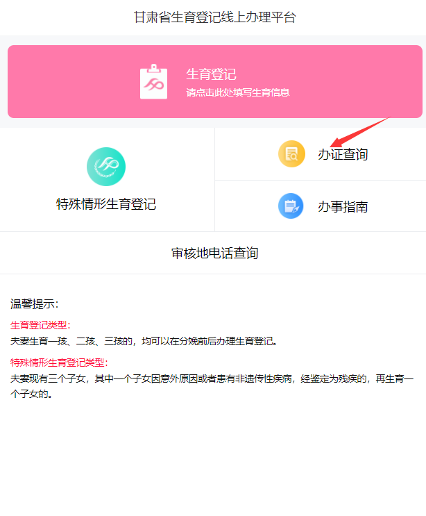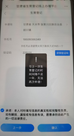 3、夫妻双方户籍都为省外,是否需要提交上传暂住证? 答:需要,在提交信息环节系统会提示上传暂住证。 4、为什么使用甘快办和健康甘肃APP进入生育登记系统会出现无法上传图片的情况? 答:主要原因为手机APP没有赋予图片存储权限,导致无法上传图片。解决办法:可通过手机“设置”中“隐私”选项中点击权限管理,进入应用,点击甘快办或者健康甘肃赋予图片存储权限就可以上传图片了,部分手机因手机系统差异需要重启才会生效(建议使用微信扫码进行办理)。 5、为什么在填报信息环节结婚日期不能手动选择? 答:如果出现结婚日期不能选择的情况,是因为双方有一方没有达到法定结婚年龄。 6、出现特殊情况,办证方是军人没有户口本和身份证如何进行线上办理? 答:如果是军人或相关特殊群体没有户口本和身份证,可提供军官证号或其他可证明身份的材料均可线上办理证明。 7、点开上传图片放大查看后,如何退出? 答:请仔细查看界面右上角有灰色X符号,点击即可退出大图查看界面,回到操作界面。 8、在信息填报过程中遇到上一环节填报信息错误情况,如何修改? 答:可在当前界面点击“上一步”按钮,回到信息填报有误界面,对于错误信息进行修改,修改正确后再次点击“下一步”进行操作。 9、关于默认申请地为何地问题? 答:若如夫妻双方均是甘肃省户口,则申请地默认为女方户口所在地;若夫妻双方有一方是甘肃省户口,则申请地默认为甘肃省户籍地的地址。 10、预留联系方式可否预留亲属号码? 答:不可,预留联系电话必须是男女双方中的一方常用电话,且需与之前页面中填报的电话号码保持一致,联系方式必须能够正常使用接受验证码,否则,后期无法打印证书。 11、办证信息提交后如何查看办理进度? 答:可进入办理界面,点击“办证查询”模块,查看办理进度。 12、遇到办理进度过慢情况,如何催办? 答:进入网页端或者手机端首页,点击“审核地电话查询”模块,进入查询界面,选择填报信息时所登记的户籍地,查询户籍地工作人员联系方式,咨询办理进度。 13、在办理过程中,系统提示“一年之内不能重复申请”情况如何处理? 答:根据办理规则,10个月内只能提交一次,不可重复办理,之前申请不通过的信息可通过公众端办证查询进行修改。
