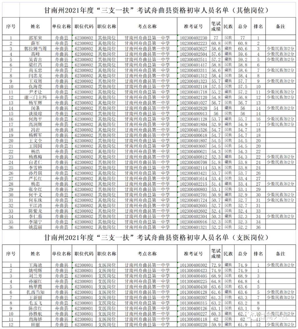 甘肃省2021年普通高校毕业生“三支一扶”选拔考试成绩已在甘肃省人力资源考试中心网站进行公布。根据《关于印发甘南州2021年选拔招募普通高校毕业生到基层从事“三支一扶”服务实施方案的通知》、《关于分解下达2021年甘南州“三支一扶”计划选拔指标的通知》精神,已完成少数民族加分、分岗位排名工作,现将我县进入资格初审人员名单进行公布。