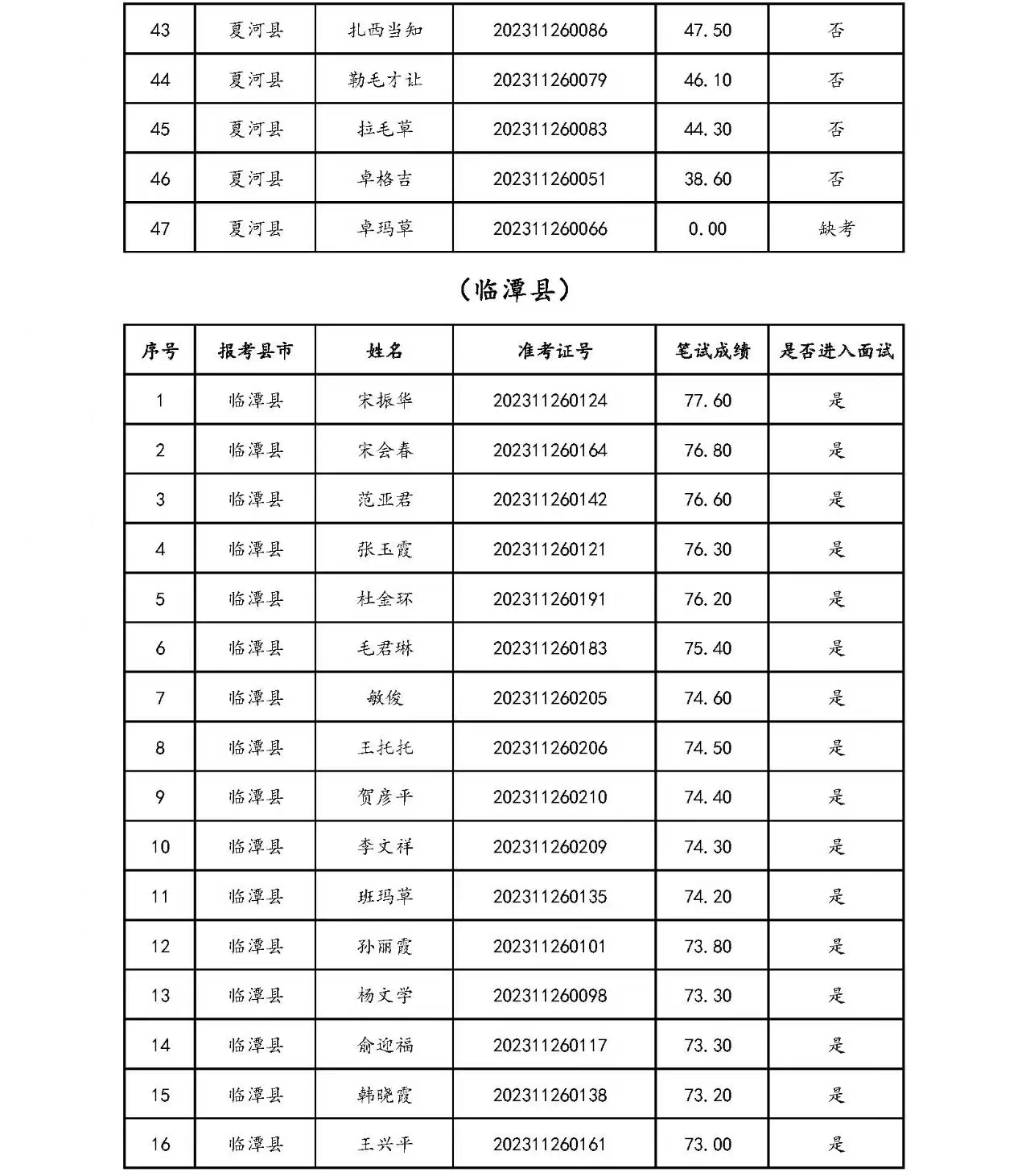 根据《甘南州2023年专业化管理的村党组织书记招聘公告》有关规定,现将笔试成绩公示如下。