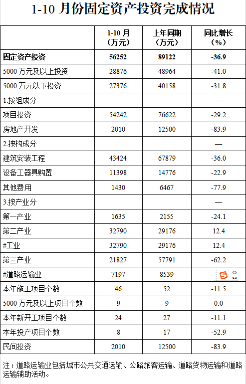 1-10月份固定资产投资额完成56252万元,同比下降36.9%。分投资额看,5000万元及以上项目投资下降41%,5000万元以下项目投资下降31.8%。分产业看,第一产业投资下降24.1%,第二产业投资增长12.4%,第三产业投资下降62.2%。从施工项目看,全县统计在库项目54个,施工项目个数46个,其中,5000万元及以上施工项目9个,同比持平;民间投资下降83.9%。