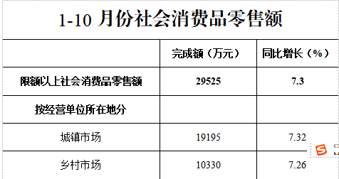 1-10月份,全县完成限额以上社会消费品零售额29525万元,同比增长7.3%。按经营单位所在地分,城镇市场完成零售额19195万元,增长7.32%;乡村市场完成零售额10330万元,增长7.26%。