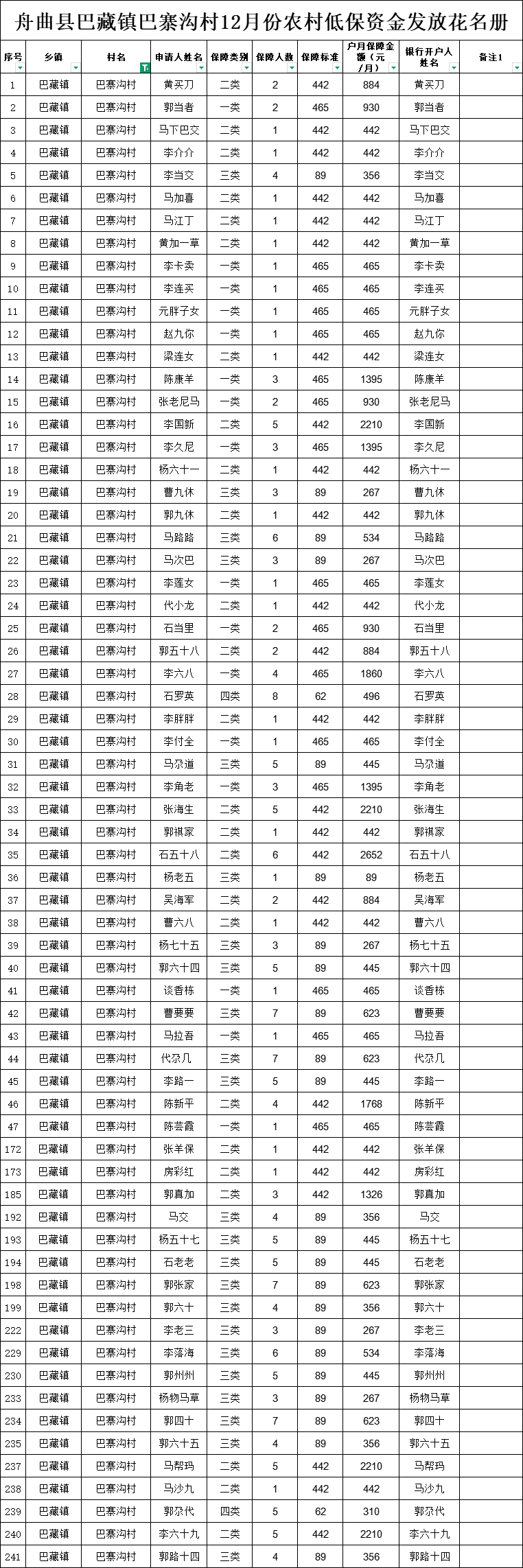 舟曲县巴藏镇巴寨沟村12月份农村低保资金发放花名册