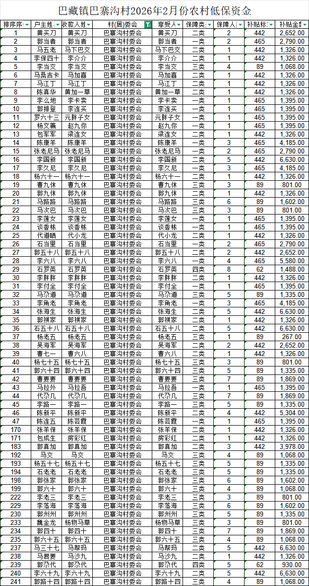 巴藏镇巴寨沟村2026年2月份农村低保资金
