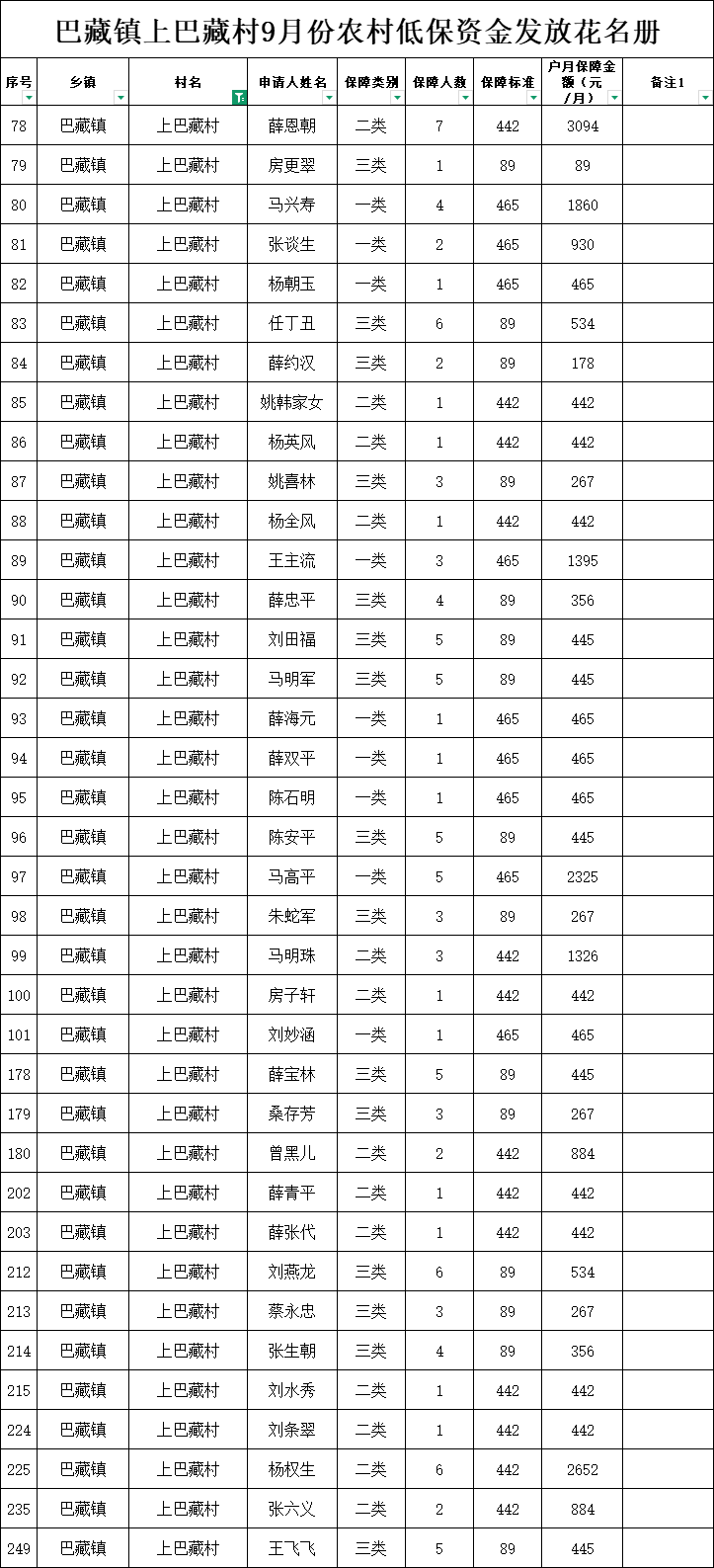 巴藏镇上巴藏村9月份农村低保资金发放花名册