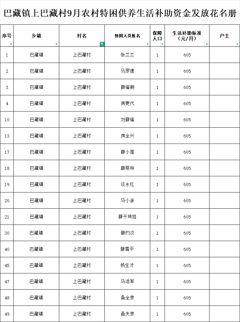 巴藏镇上巴藏村9月农村特困供养生活补助资金发放花名册