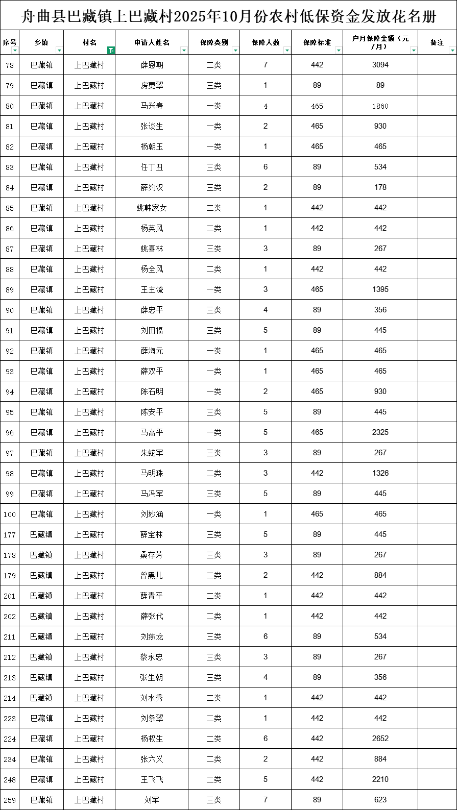 舟曲县巴藏镇上巴藏村10月份农村低保资金发放花名册