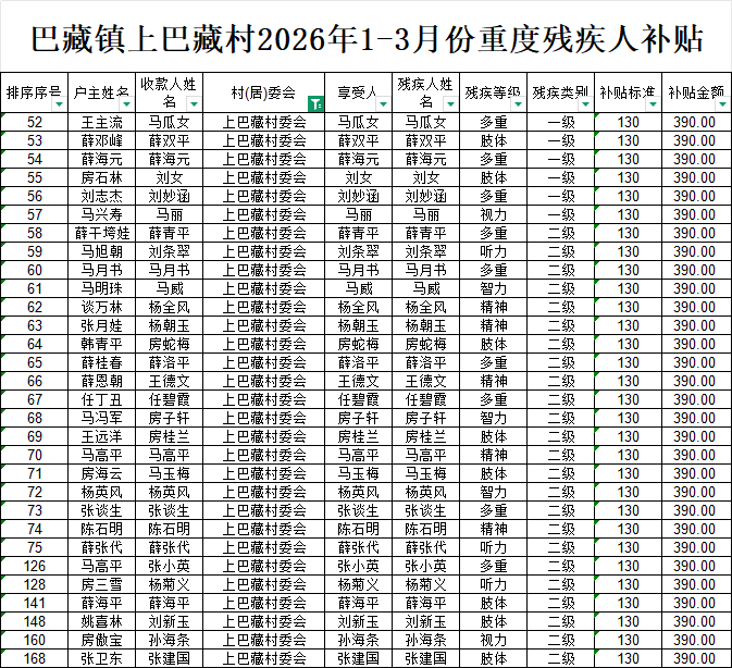 巴藏镇上巴藏村2026年1-3月份重度残疾人补贴