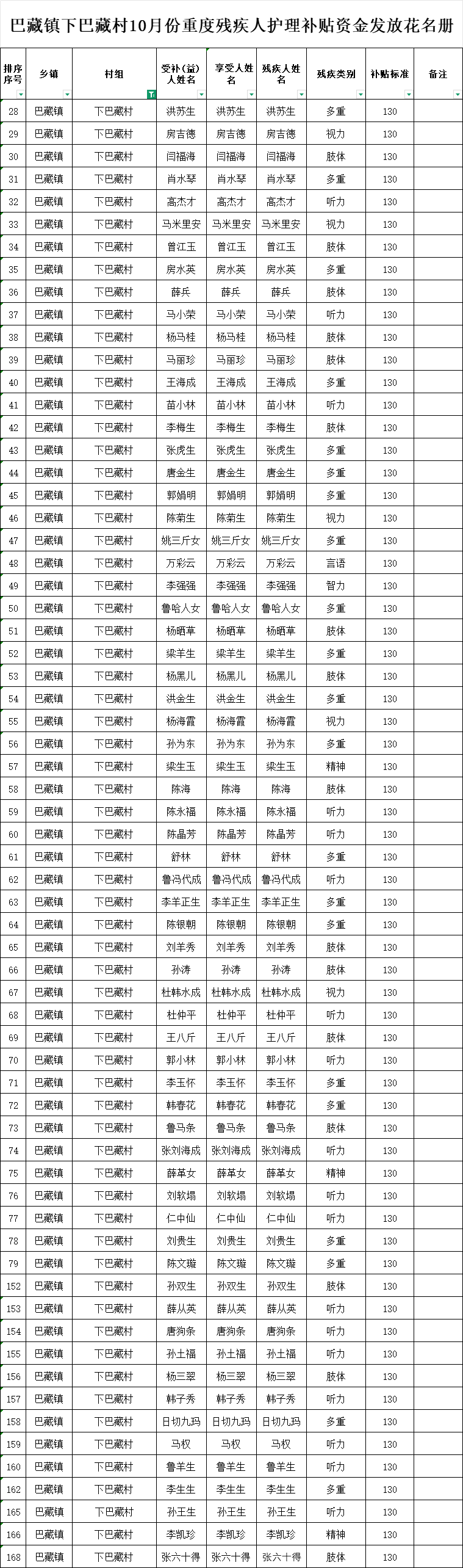 巴藏镇下巴藏村10月份重度残疾人护理补贴资金发放花名册
