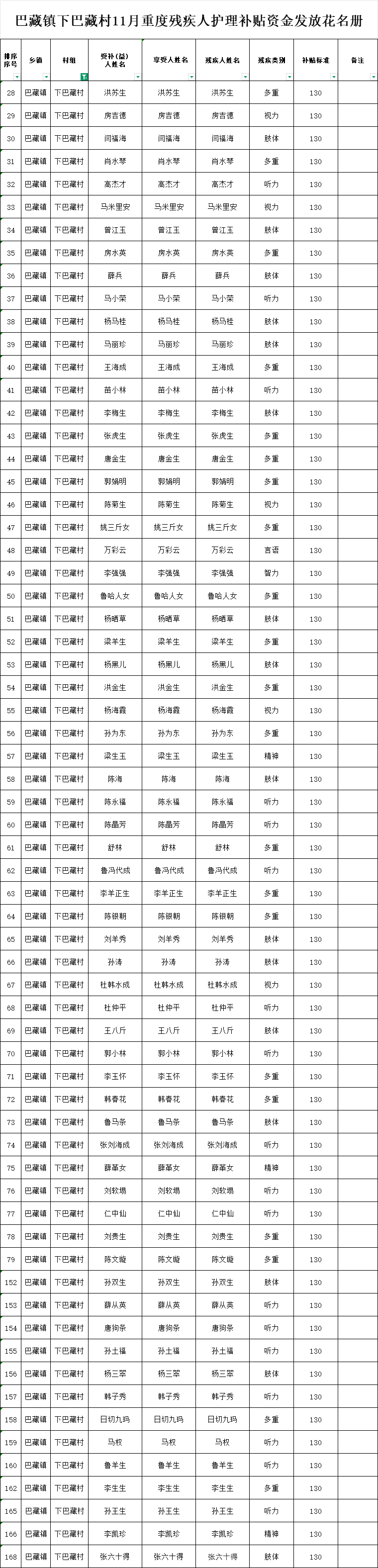 巴藏镇下巴藏村11月重度残疾人护理补贴资金发放花名册