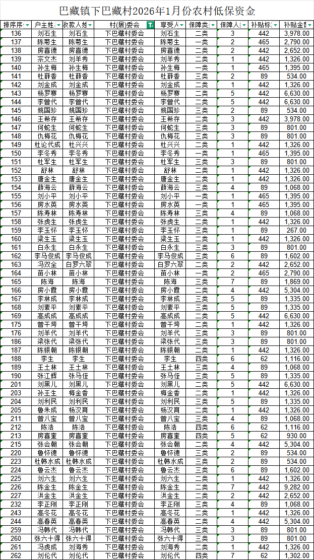 巴藏镇下巴藏村2026年1月份农村低保资金