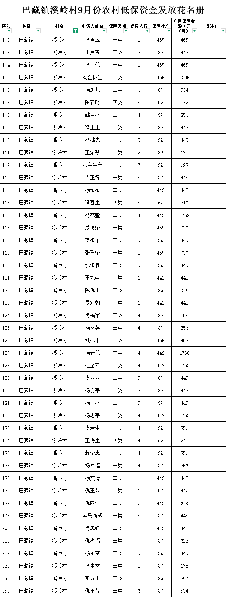 巴藏镇溪岭村9月份农村低保资金发放花名册