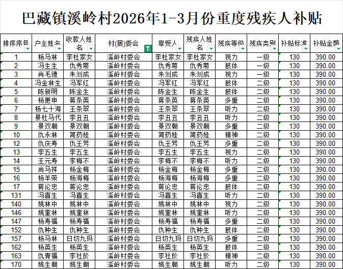 巴藏镇溪岭村2026年1-3月份重度残疾人补贴