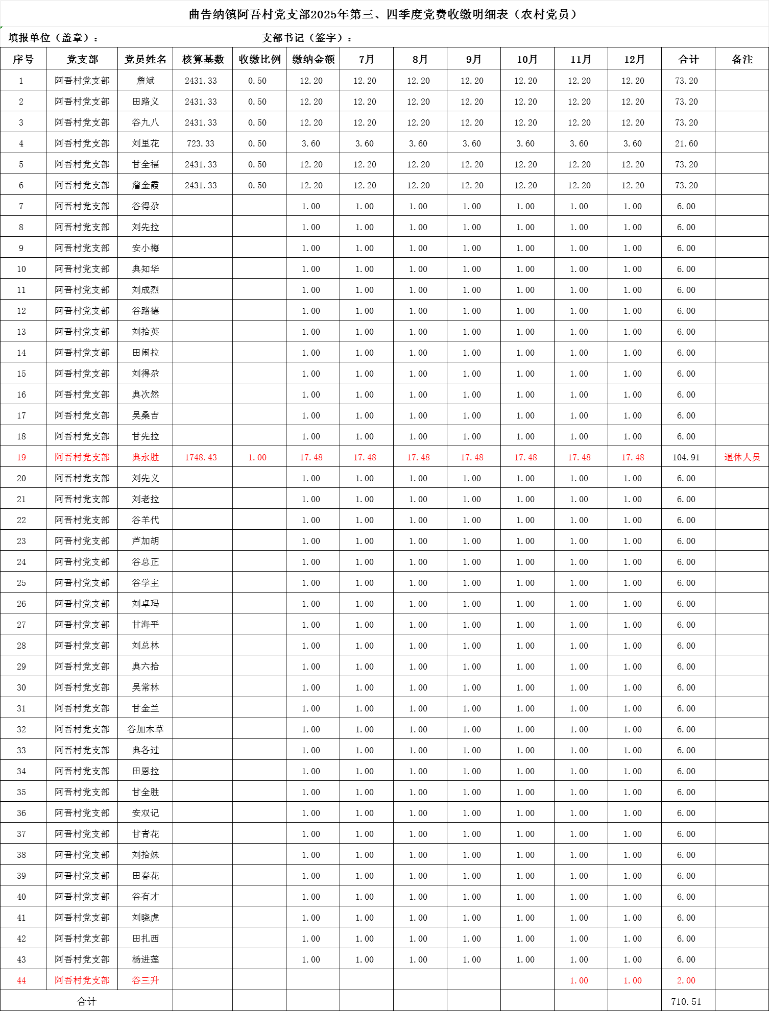 现将曲告纳镇阿吾村党支部2025年第三、四季度党费收缴明细表公示如下: