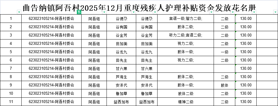 现将曲告纳镇阿吾村2025年12月重度残疾人护理补贴资金发放花名册公示如下: