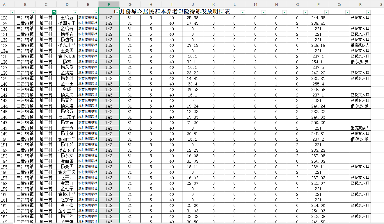 10月份城乡居民基本养老保险待遇发放明细表公示如下: