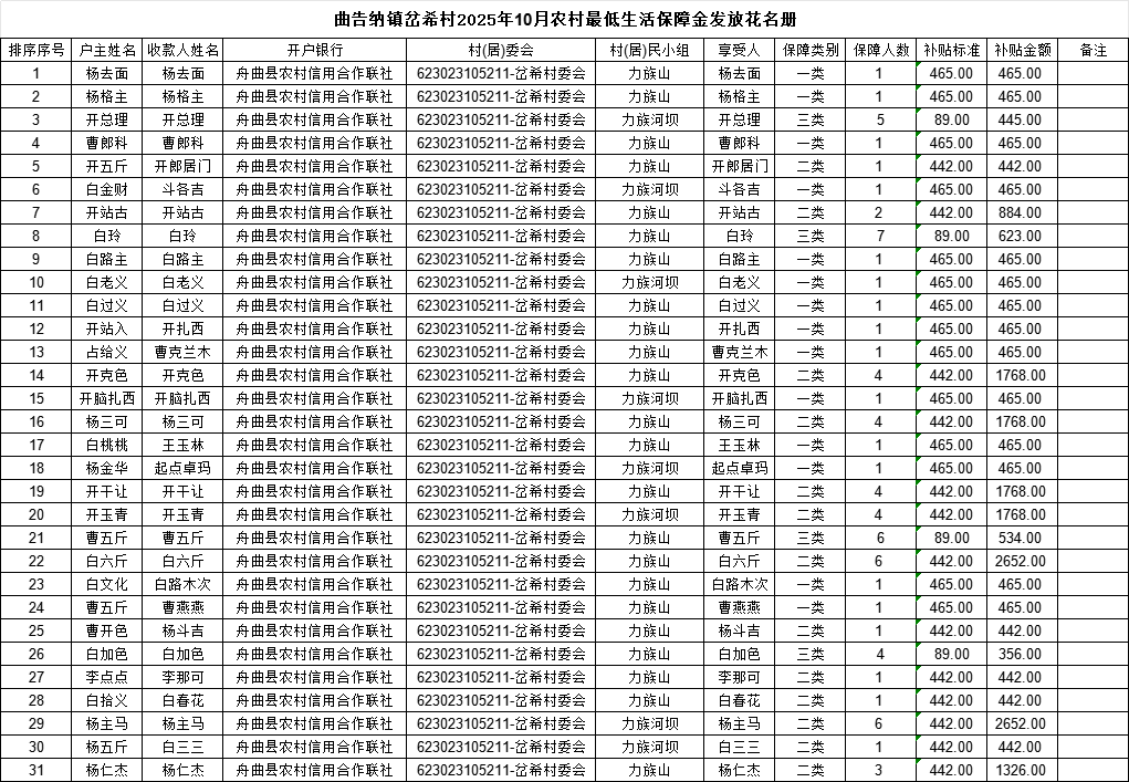 现将曲告纳镇岔希村2025年10月农村最低生活保障金发放花名册公示如下: