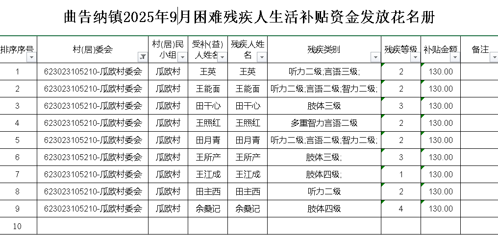 曲告纳镇瓜欧村2025年9月困难残疾人生活补贴资金发放花名册