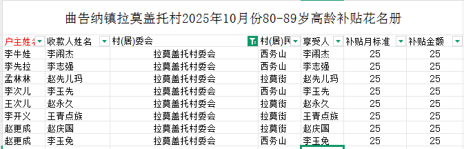 现将曲告纳镇拉莫盖托村2025年10月份80-89岁高龄补贴花名册公示如下: