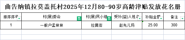 现将曲告纳镇拉莫盖托村2025年12月80-90岁高龄津贴发放花名册公示如下: