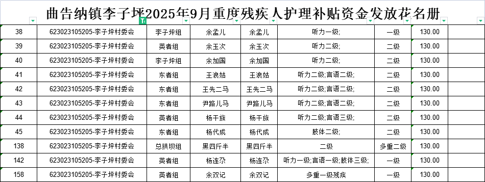 现将曲告纳镇李子坪2025年9月重度残疾人护理补贴资金发放花名册公示如下(详见附件): 曲告纳镇李子坪村村民委员会 2025年9月15日  |