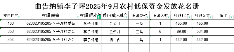 附件【曲告纳镇李子坪2025年9月农村低保资金发放花名册.xlsx】 |