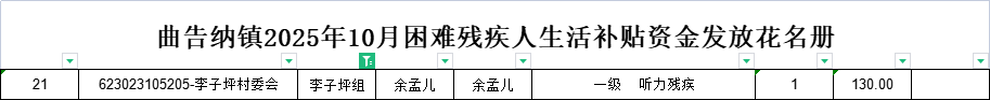 现将曲告纳镇李子坪2025年10月困难残疾人生活补贴资金发放花名册公示如下(详见如下):