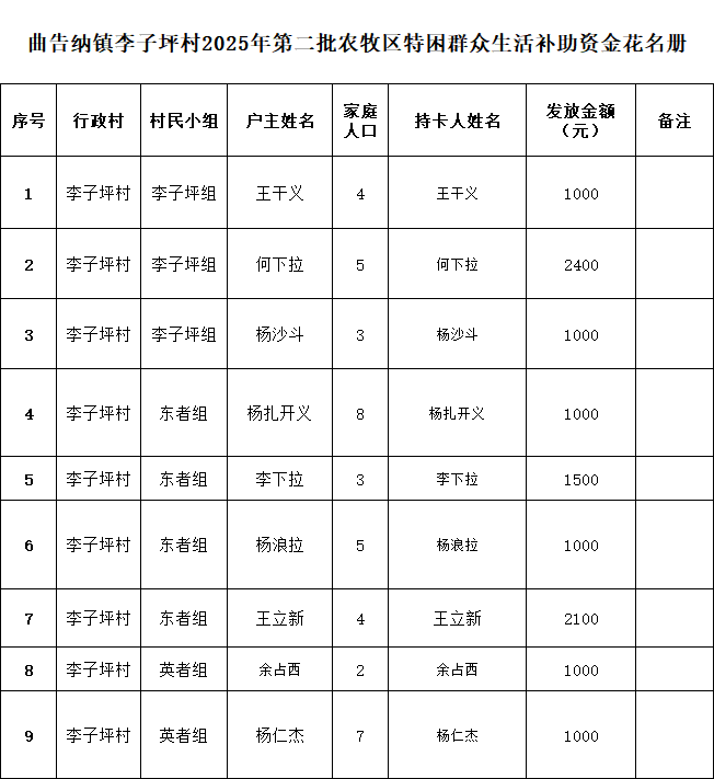 | 曲告纳镇李子坪村2025年第二批农牧区特困群众生活补助资金花名册 |