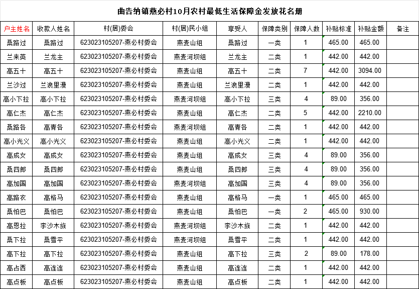 现将曲告纳镇燕必村10月农村最低生活保障金发放花名册公示如下: