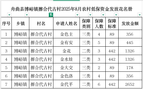 博峪镇擦合代古村2025年8月农村低保发放花名册