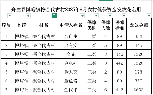 博峪镇擦合代古村2025年9月农村低保发放花名册