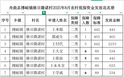博峪镇格日隆诺村2025年8月农村低保发放花名册
