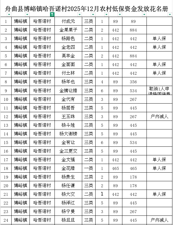 舟曲县博峪镇哈吾诺村2025年12月农村低保资金发放花名册