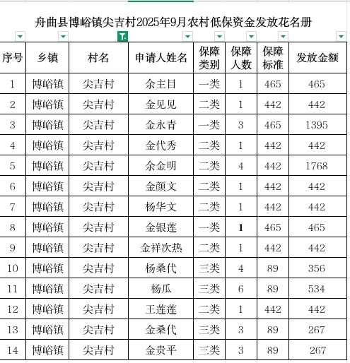 博峪镇尖吉村2025年9月农村低保发放花名册