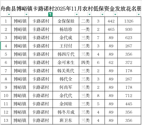舟曲县博峪镇卡路诺村2025年11月农村低保资金发放花名册