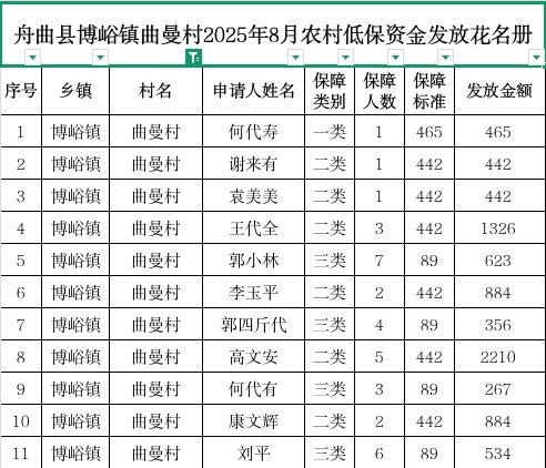 博峪镇曲曼村2025年8月农村低保发放花名册